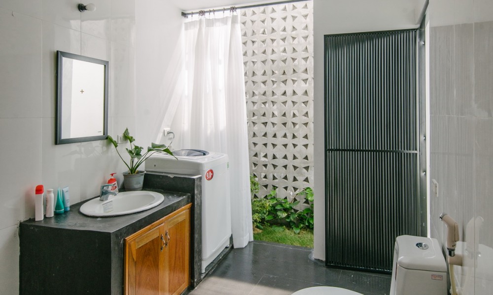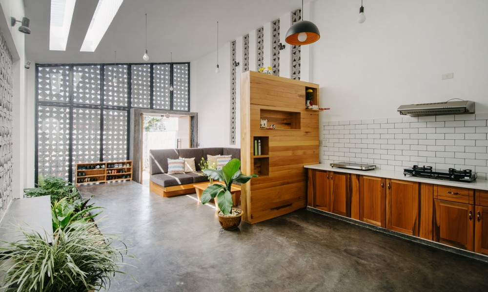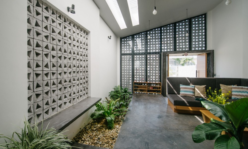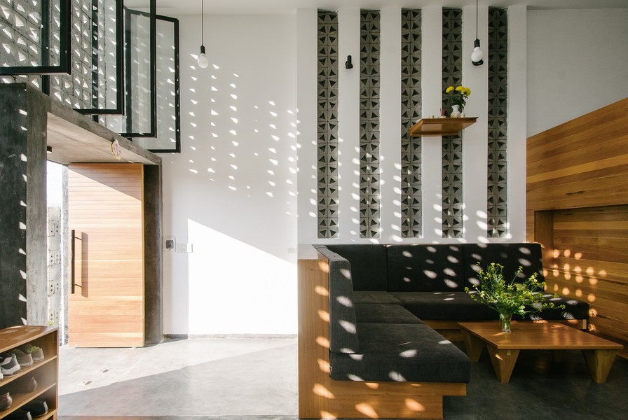 Từ phòng khách, khu bếp đến phòng ngủ và khu vệ sinh đều tận dụng tối đa ánh sáng tự nhiên nhờ những giếng trời và những khu vườn nho nhỏ. Gam màu sử dụng trong nội thất được tiết giảm tối đa, nhường chỗ cho điểm nhấn của màu xanh cây cỏ, màu xám tự nhiên của sàn xi măng, màu vàng ấm của những vật dụng đồ gỗ thô mộc cùng hệ khối hoa gió đúc thô với họa tiết bắt mắt.