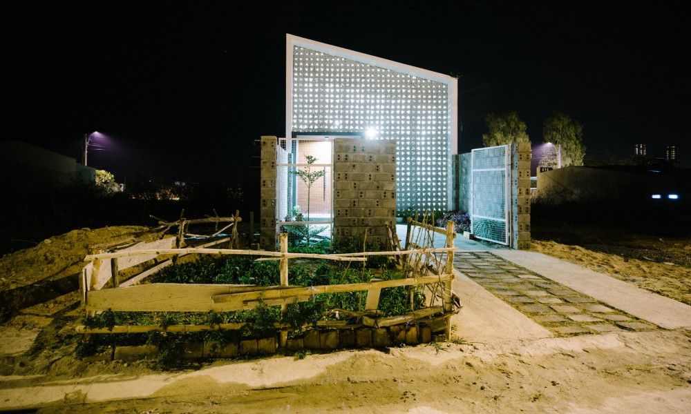 Công trình sử dụng vật liệu gồm gạch không nung tại địa phương, gạch hoa gió đúc xi măng để thô và gỗ sẵn có tại nhà. Điểm nổi bật và ấn tượng trong thiết kế khi xuất hiện về đêm.