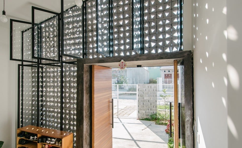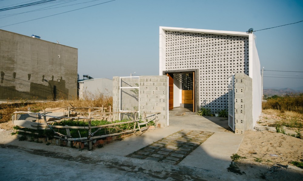 Hình khối căn nhà đơn giản với hệ mái dốc. Bức tường hoa gió giúp tách biệt không gian trong và ngoài nhà nhưng vẫn đảm bảo sự tương tác nhất định, mang lại cảm giác thoáng mát và riêng tư. Lớp cửa kính bên trong chính là mấu chốt giúp căn nhà linh hoạt trong vấn đề điều tiết lượng gió đi vào nhà trong những điều kiện thời tiết khác nhau tùy theo mùa.